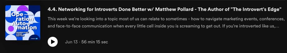 | New on the Operation: Automation podcast 🎙️ | | | | In this episode, we're looking into a topic most of us can relate to sometimes - how to navigate marketing events, conferences, and face-to-face communication when every little cell inside you is screaming to get out. If you're introverted like us, you're gonna love the tips Matthew gives you. | | | |